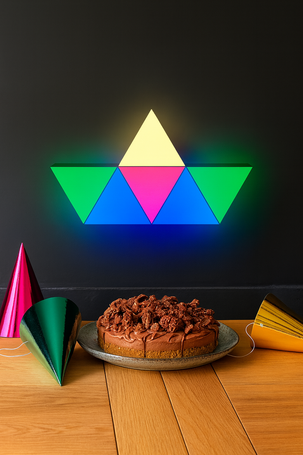 The Nanoleaf Triangle Panels bring your creativity to life. These modular LED panels let you connect and arrange them into endless shapes and patterns—triangles, squares, or your own custom design. Perfect for a gaming setup, home office, or living room, they instantly turn any wall into a bold visual statement.